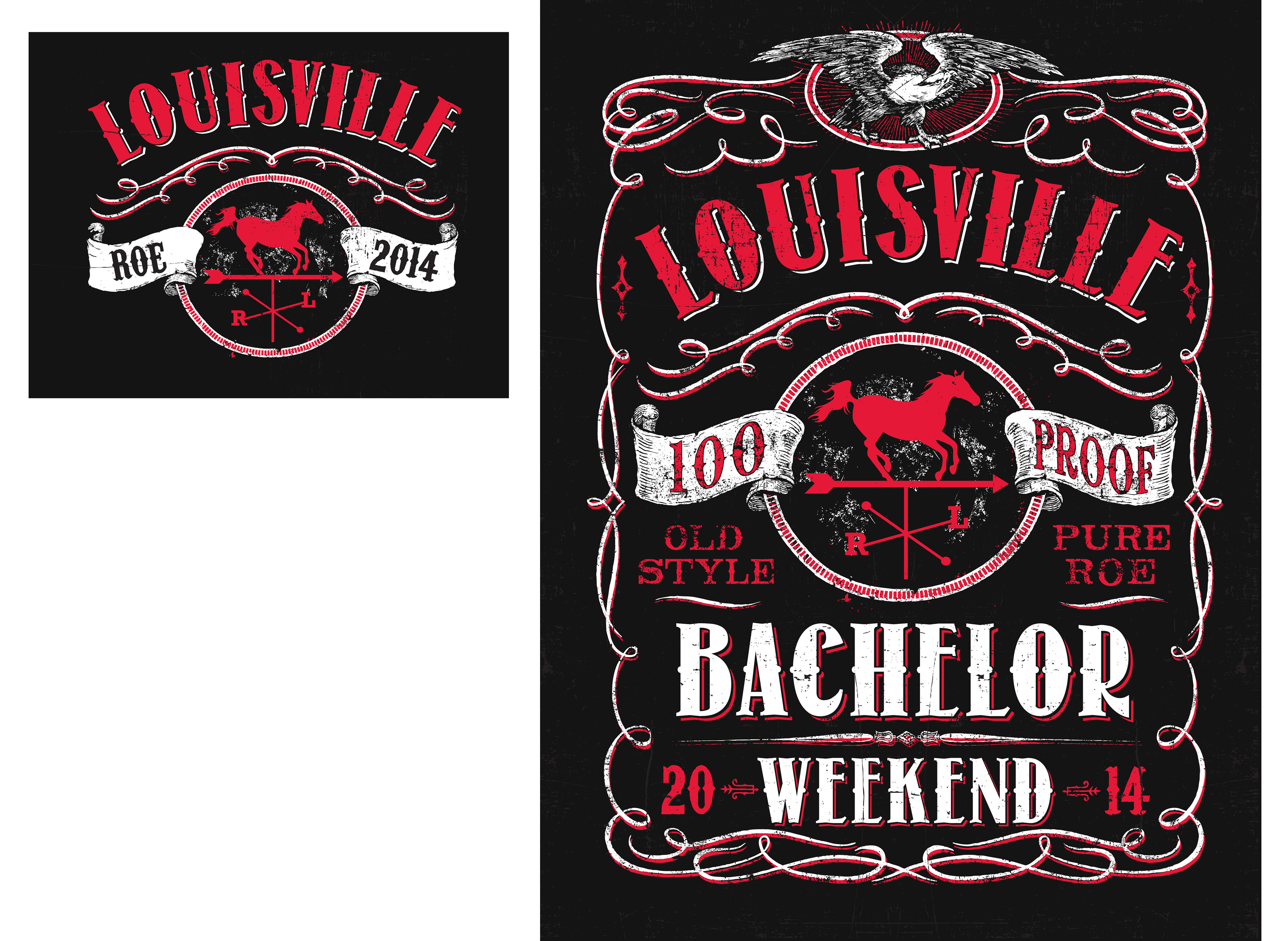 This design was screen printed on the left chest & full back of black t-shirts, created for a bachelor party weekend in Louisville, KY